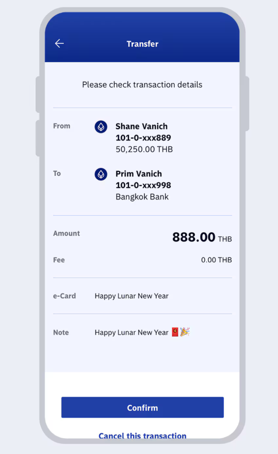 Users should be presented with a screen that shows the party to whom they are sending funds that reflects a standardized name selected by a user at account setup and requires confirmation prior to the payment being initiated. See Confirmation of Payee Practice.